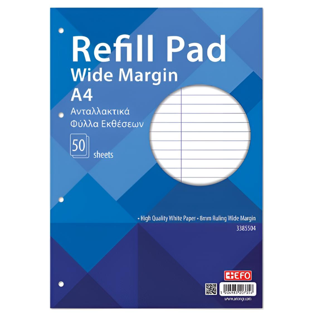 Ανταλλακτικά Φύλλα για Ντοσιέ. Διάσταση Α4. Γραμμογράφηση Εκθέσεων με μεγάλο περιθώριο. Αριθμός Φύλλων 50