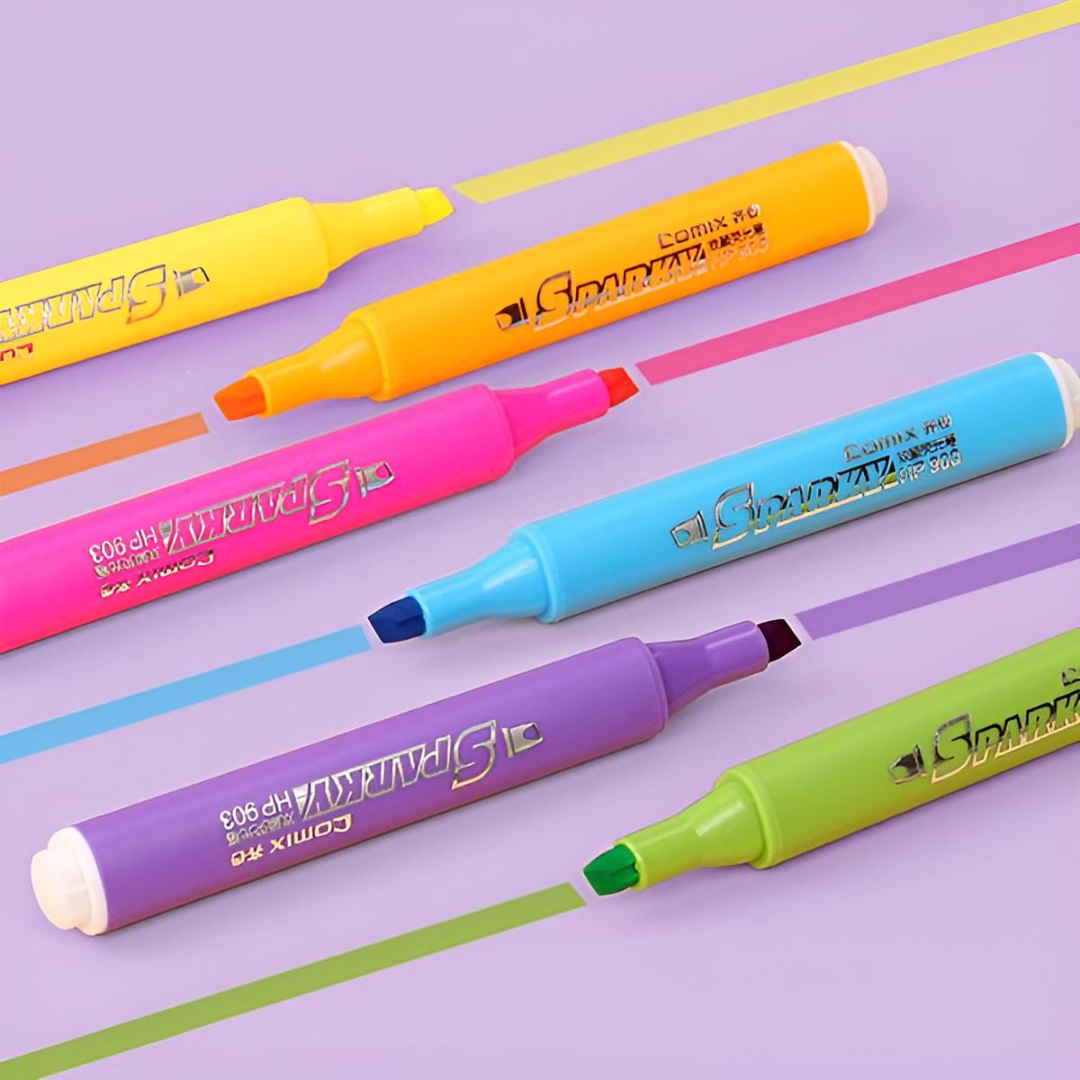 Comix τριγωνικοί μαρκαδόροι υπογράμμισης (φωσφορούχοι). Η ειδική μύτη τους επισημαίνει και υπογραμμίζει σημαντικά μέρη των εγγράφων σας και έχει πλάτος γραμμής 1mm έως 4mm. Ένα σετ 6 χρωμάτων, που θα κάνει την εργασία σας πολύχρωμη.
