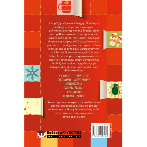 Ονομάζομαι Έρνεστ Κάνιγχαμ. Παλιότερα διάβαζα μετά μανίας αστυνομικά μυθιστορήματα της Χρυσής Εποχής, μέχρι που βρέθηκα μπλεγμένος σε πραγματικές καταστάσεις αυτού του είδους… Δεν είμαι ιδιωτικός ερευνητής, απλώς τυχαίνει να έχω μια έφεση στην εξιχνίαση μυστηρίων. Βέβαια, πίστευα πως οι δολοφόνοι χαλαρώνουν την περίοδο των Χριστουγέννων, αλλά έκανα λάθος. Οπότε να με στο χριστουγεννιάτικο σόου του παγκοσμίου φήμης μάγου Ράιλαν Μπλέιζ, του οποίου ο ευεργέτης έχει δολοφονηθεί. Οι ύποπτοι είναι όλοι τους εξπέρ στα κόλπα: