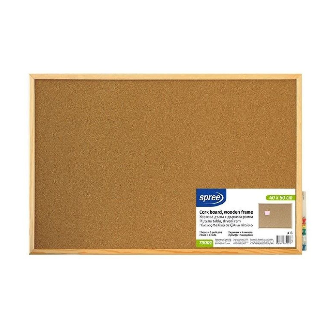 Άνετος για το σπίτι, το γραφείο ή την τάξη, ο φελλός πίνακας από τον κατάλογο της Spree θα είναι ένας εξαιρετικός βοηθός για να κρεμάτε σημαντικές πληροφορίες, ζωγραφιές ή σημαντικό σχολικό υλικό. Ο πίνακας είναι κατασκευασμένος από φελλό και το πλαίσιο είναι από ξύλο. Στη μία πλευρά του πλαισίου υπάρχει χώρος όπου μπορείτε να αποθηκεύετε καρφίτσες για τον πίνακα.