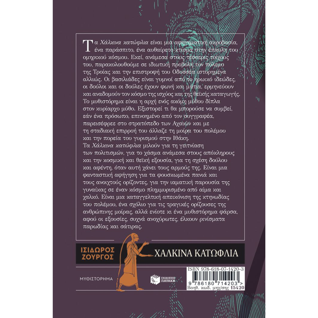 Τα «Χάλκινα κατώφλια» είναι μια αφηγηματική ακροβασία, ένα παράσπιτο, ένα αυθαίρετο κτίσμα στην έπαυλη του ομηρικού κόσμου. Εκεί, ανάμεσα στους τέσσερις τοίχους του, παρακολουθούμε σε ιδιωτική προβολή τον πόλεμο της Τροίας και την επιστροφή του Οδυσσέα ιστορημένα αλλιώς. Οι βασιλιάδες είναι γυμνοί από το ηρωικό ιδεώδες, οι δούλοι και οι δούλες έχουν φωνή και μάτια, ερμηνεύουν και αναδομούν τον κόσμο της ισχύος και της θεϊκής καταγωγής.
